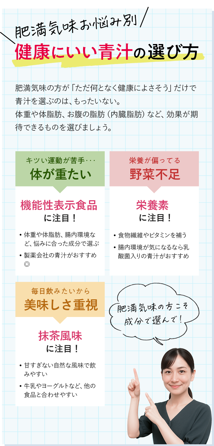 健康の悩みに合った機能性関与成分を選び、青汁を始めましょう。